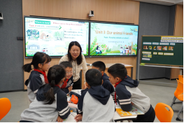 随后,研修班成员深入课堂,近距离观摩多元学科教学实践:陆东玲老师执教五年级上册语文《松鼠》,生动诠释文本魅力;王珏老师带来三年级上册数学《轴对称图形》,让抽象知识直观可感;姜娟副校长执教五年级上册英语《Keeping animals at school》,课堂互动氛围热烈;叶陈靓老师的音乐课堂《哈啰!哈啰!》,用旋律传递快乐;张秋明老师为五六年级学子开展《足球训练》,展现体育教学的活力与专业性。