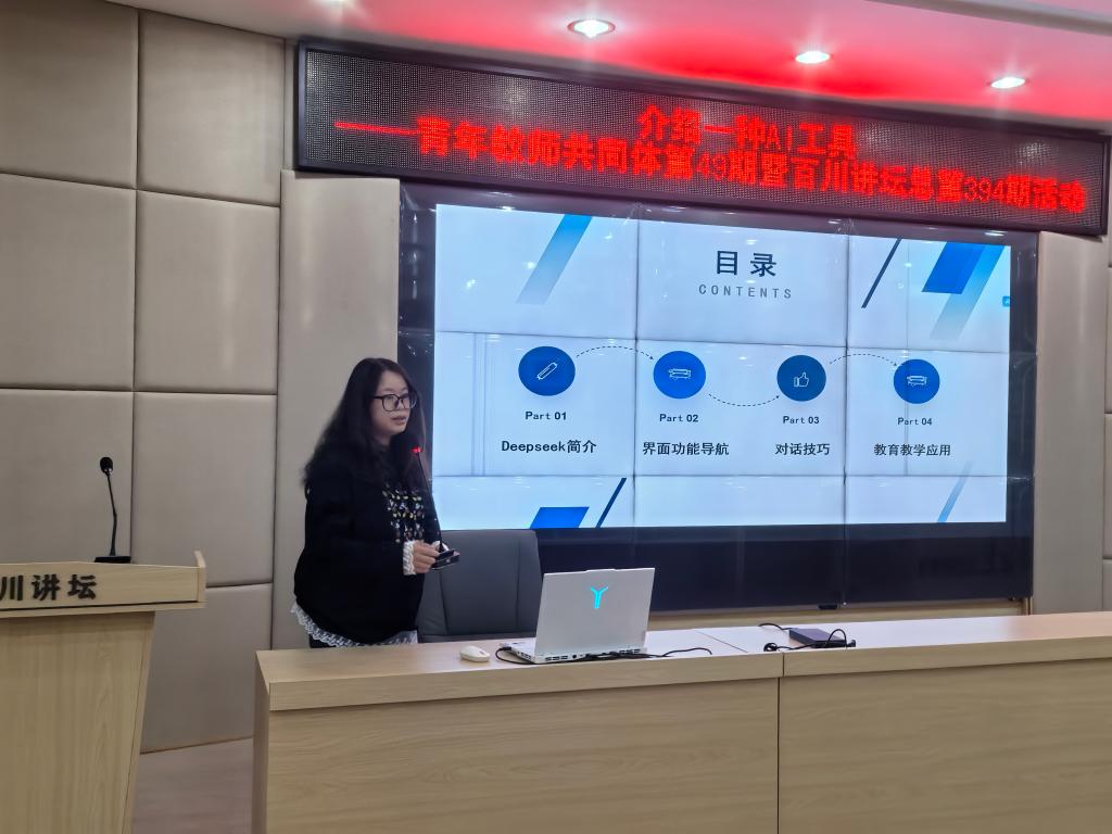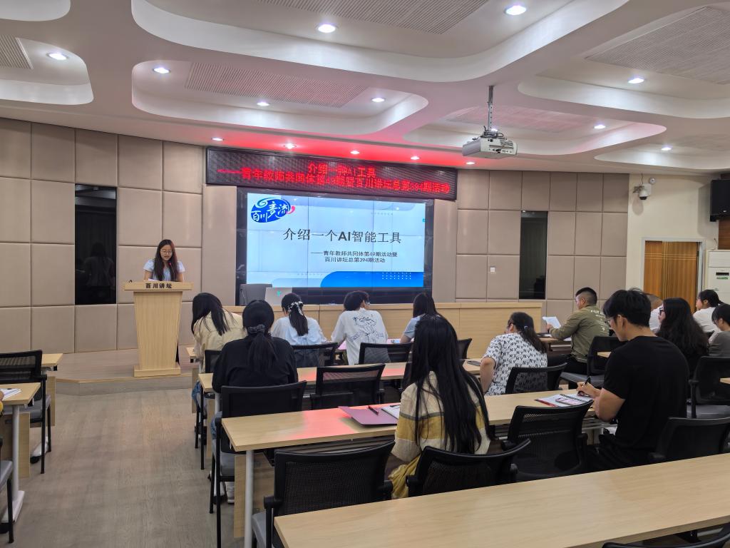 2025年10月14日上午,青年教师共同体成员在学校多功能厅迎来了第49期青年教师共同体活动暨百川讲坛总第394期活动。本期活动以“介绍一种AI工具”为主题,由四位老师作为代表,分享他们对不同AI工具的深度实践与独到见解。
