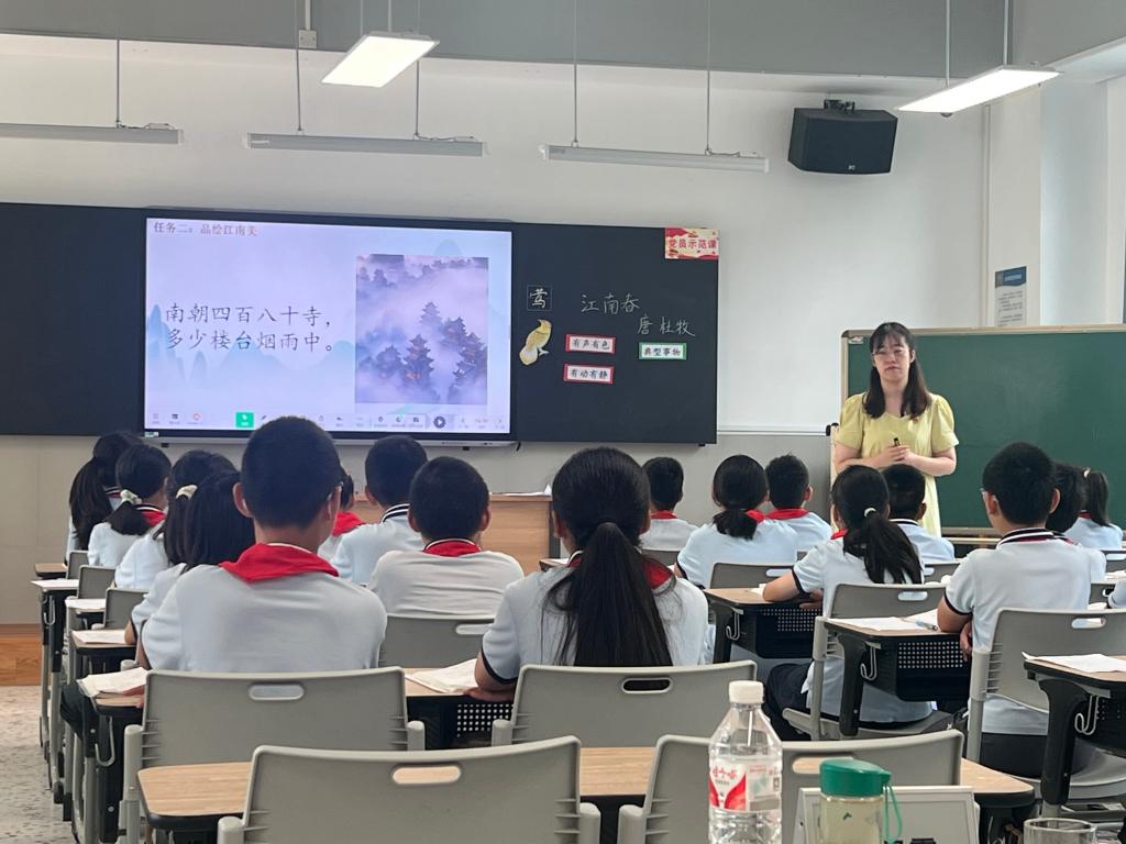 冯晨姝老师率先执教五年级《古诗三首》,以生动的教学设计与数字技术的巧妙运用,带领学生沉浸式感受古典诗词的意境之美;随后,肖烨老师在课堂上带来六年级《江南春》教学,凭借扎实的教学功底与创新的互动形式,让学生在品诗赏词中领悟江南春日的独特韵味。
