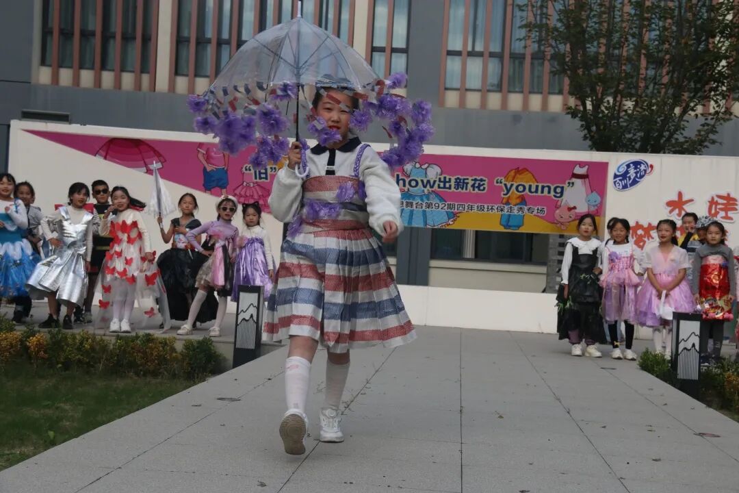 四年级的水娃们穿着亲手制作的服装,用精彩的T台秀,带来了一场充满创意与活力的视觉盛宴,传递着“只要有创意,废品也能变宝贝”的理念。